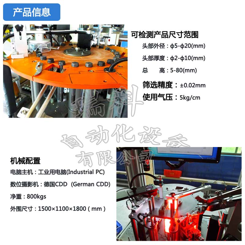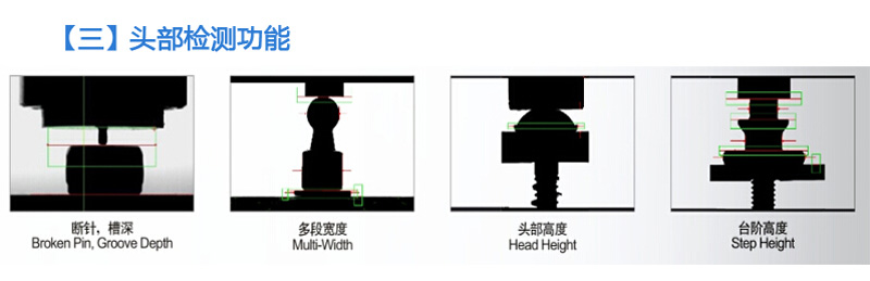 • 本系統檢測功能包括多段高度、多度寬度,斷針、塞孔,無效牙長(頸下牙高),牙底徑,牙外徑,牙距,斜牙、搓牙不良,螺絲長度,頭部有無電鍍,有無倒角,塞孔,偏心,有無牙
