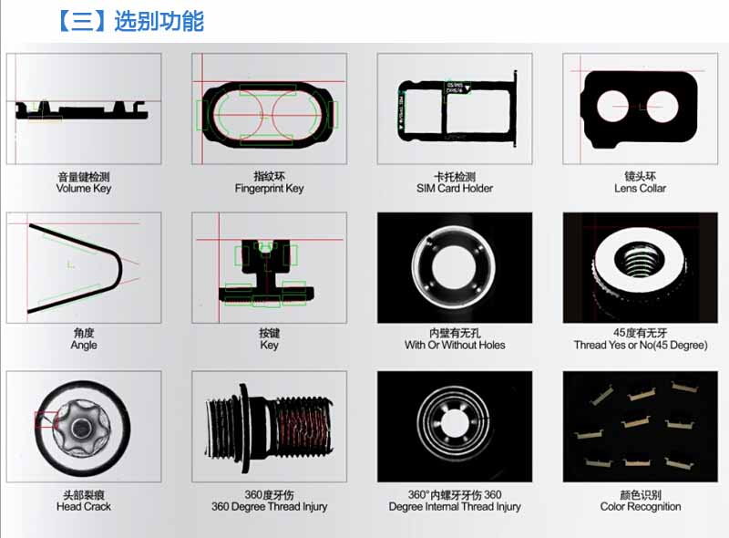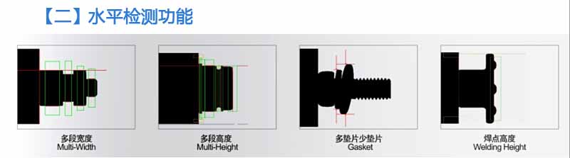 • 本系統(tǒng)檢測(cè)功能包括多段高度、多度寬度,斷針、塞孔,無(wú)效牙長(zhǎng)(頸下牙高),牙底徑,牙外徑,牙距,斜牙、搓牙不良,螺絲長(zhǎng)度,頭部有無(wú)電鍍,有無(wú)倒角,塞孔,偏心,有無(wú)牙。